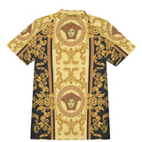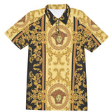 - Short sleeve, raglan sleeve, stand-up collar, button closure