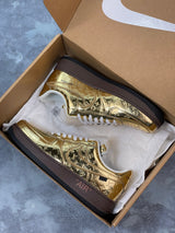 Introducing the Gold NK Air Force 1 LV Sneakers. With a sleek design and superior craftsmanship, these sneakers are perfect for any occasion. Made with premium materials, they offer both style and comfort. Elevate your shoe game with these must-have sneakers.