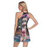 Perfect sexy dress in this summer. The metal half moon ring and halter strap outline a sexy and charming curve