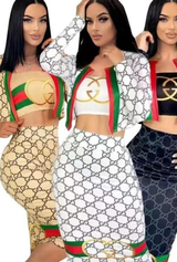 This Fancy Designer Bodycon Casual Three Piece Luxury Skirt Set is made from Gucci fabric, perfect for a classic and sophisticated look. Its three-piece design offers you full coverage for all occasions, making it an essential wardrobe addition.
