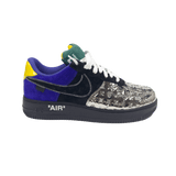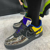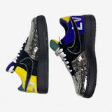 The Louis Vuitton X Nike Air Force 1 Low-Top Sneakers combine style and performance with a chrome toe, monogram suede, and mirror coated canvas design. Featuring Kai Cenat's signature touch, these sneakers offer a unique and luxurious look while providing comfort and durability for everyday wear. Elevate your sneaker game with these statement-making kicks.